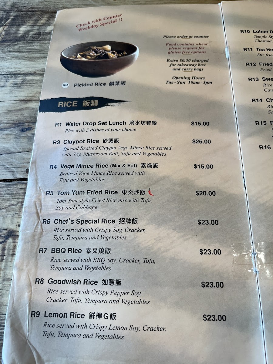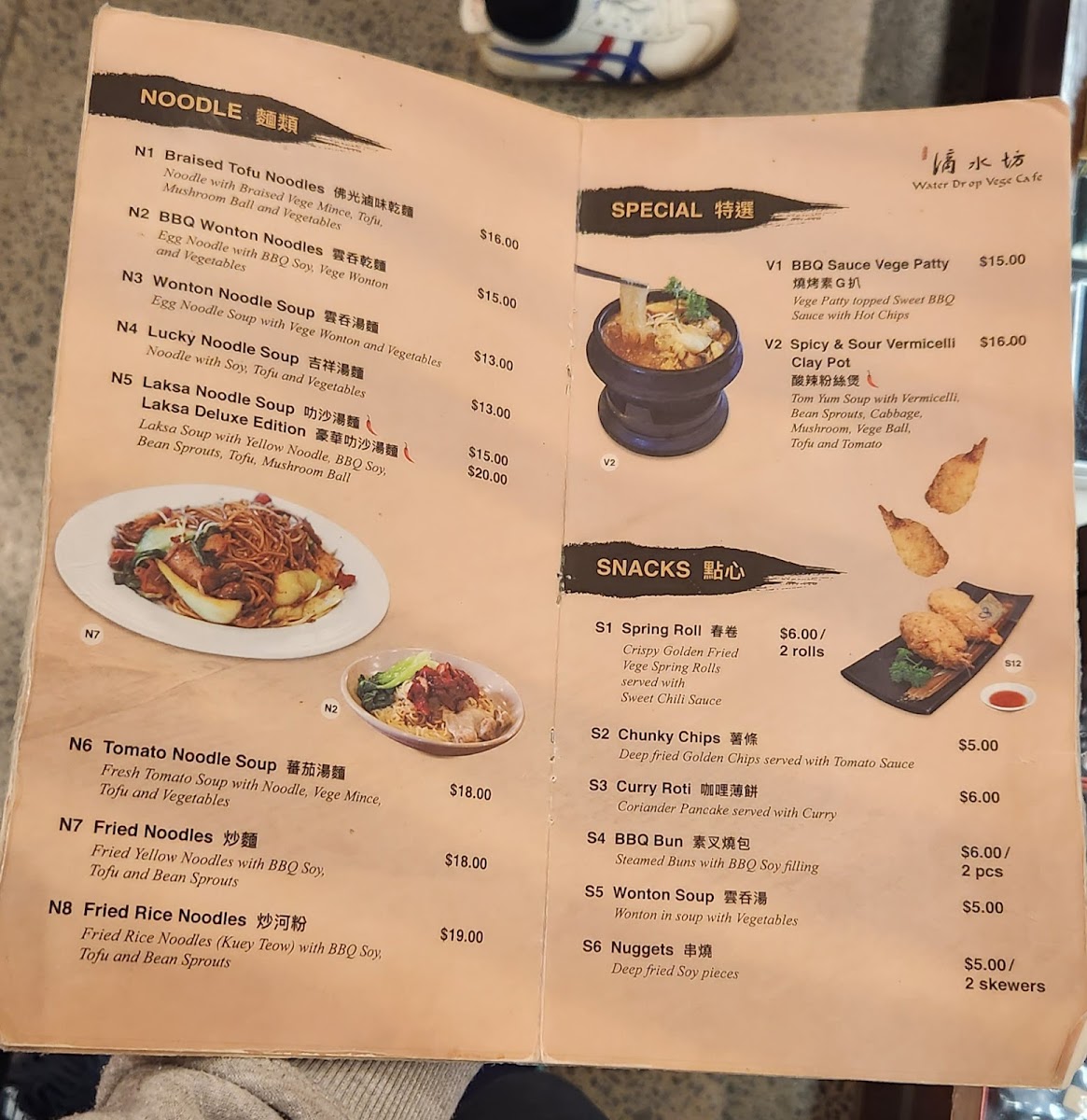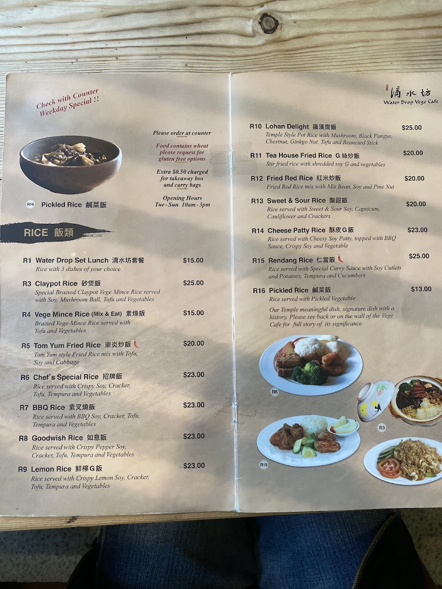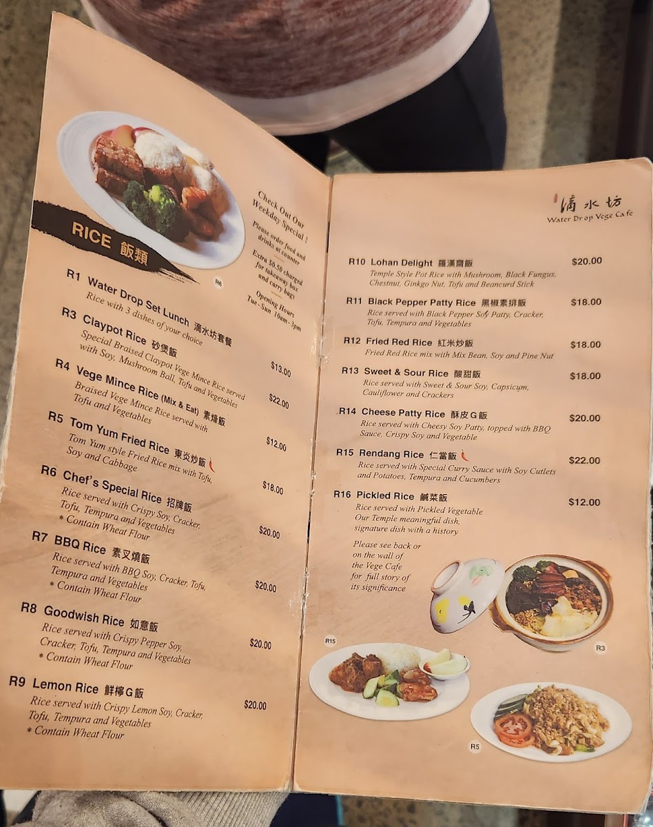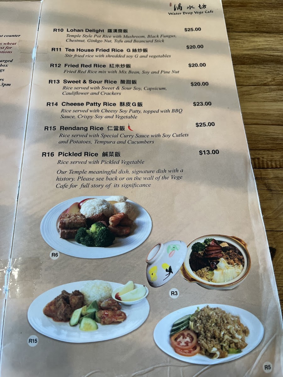 What truly elevates the menu are the Special and Noodle, 麵類 categories. Dishes like BBQ Sauce Vege Patty and Spicy & Sour Vermicelli Clay Pot highlight the kitchen’s ability to build deep, satisfying flavors without meat, while noodle options such as Braised Tofu Noodles, BBQ Wonton Noodles, Wonton Noodle Soup, Lucky Noodle Soup, Laksa Noodle Soup, and Laksa Deluxe Edition provide rich broths and generous textures that feel indulgent yet wholesome. Finally, the Others section, featuring Nasi Lemak, Herbal Soup Set, Hainan Crispy, and Vege Ball Soup, rounds out the menu with comforting, home-style dishes that leave a lasting impression. Overall, the menu feels complete and carefully curated, making Water Drop Vegetarian Cafe a satisfying destination for both dedicated vegetarians and curious diners alike.